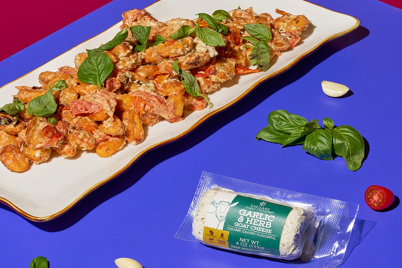 Tender gnocchi and roasted cherry tomatoes are tossed with fragrant basil and LaClare Creamery Garlic & Herb Goat Cheese, creating a flavorful one-pan Italian-inspired dish.