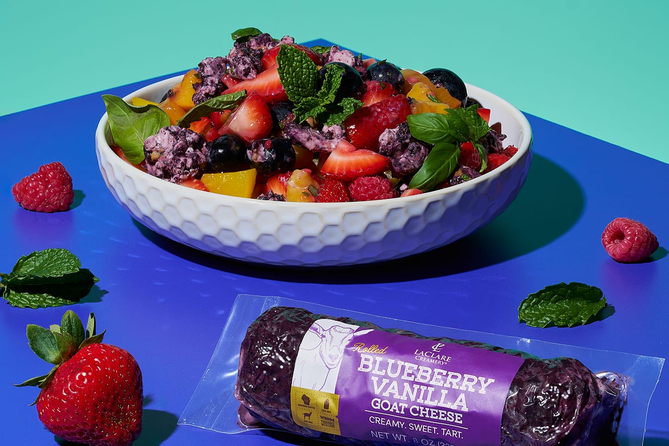 A vibrant mix of fresh berries, peaches, and mango is tossed with herbs and lemon juice, then topped with creamy, sweet-tart LaClare Creamery Rolled Blueberry Vanilla Goat Cheese.